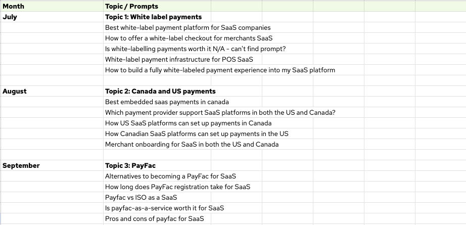 We believe a crucial aspect of generating leads with LLM focused work is targeting the right topics. Just like with SEO, creating content on Top of the Funnel topics like “What is a payment gateway” will increase your visibility, but it’s unlikely to bring in new customers. Targeting topics that are Bottom of the Funnel, like “Best embedded payment solutions” are a lot more likely to translate into leads.