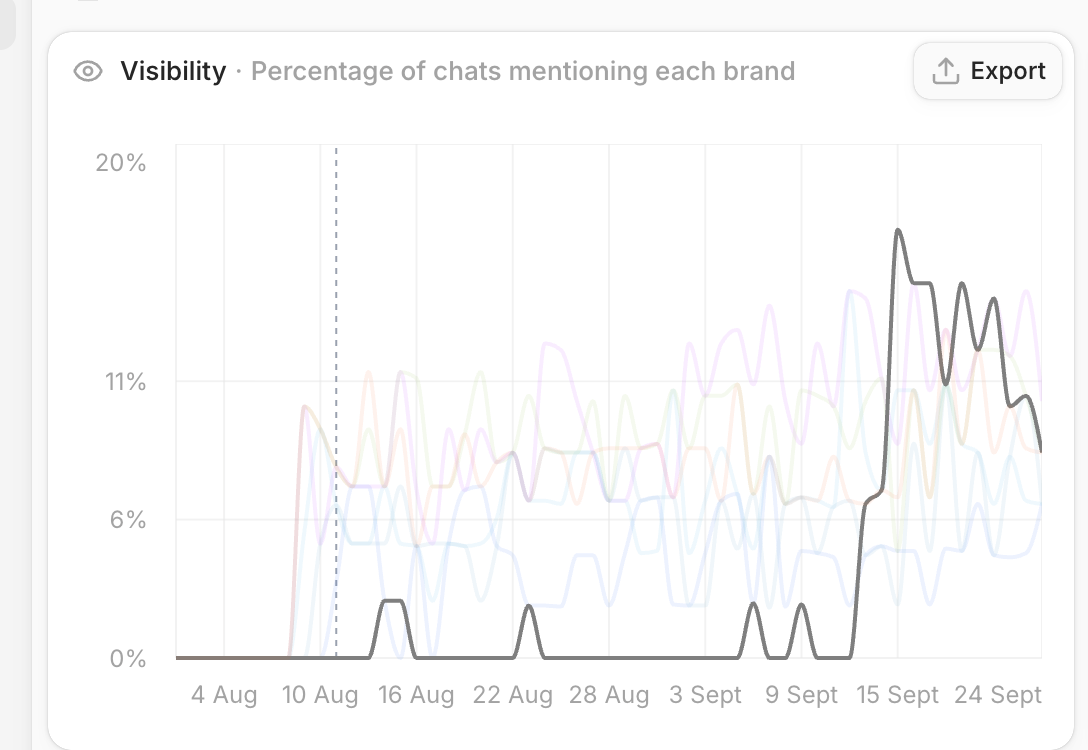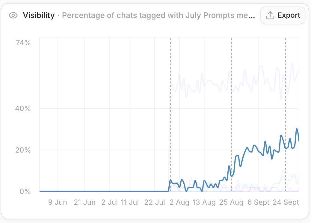 After less than one month of work, we saw their visibility start to grow substantially. Filtering for only prompts added on the 29th July, you can see their visibility grew to an astounding 56.6% by the end of September, outcompeting other companies with much bigger budgets.
