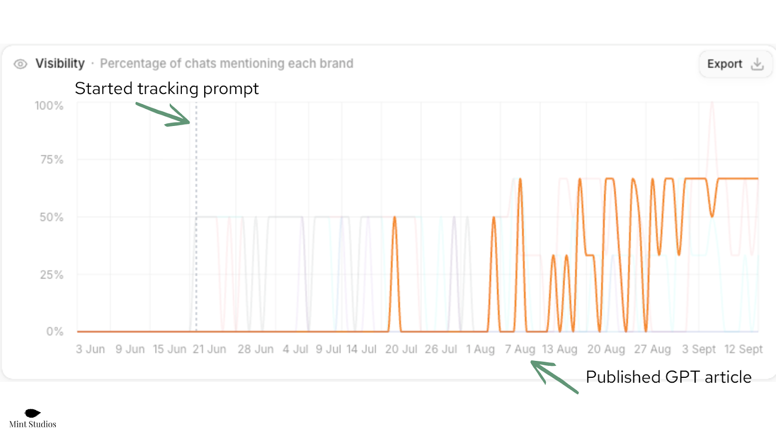 By the end of our test, nearly every single prompt we had targeted with a GPT article had grown in visibility, and there was a clear growth before and after we published the GPT article.