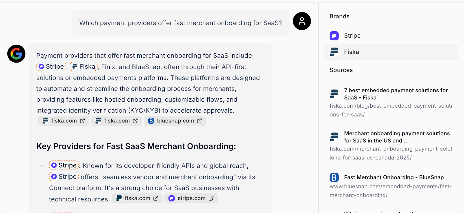 Not only was Fiska being mentioned more, it was also being cited a lot more next to companies like Stripe. And if you don’t trust Peec’s response, you can still see Fiska turn up if you head to Gemini / ChatGPT / Perplexity: