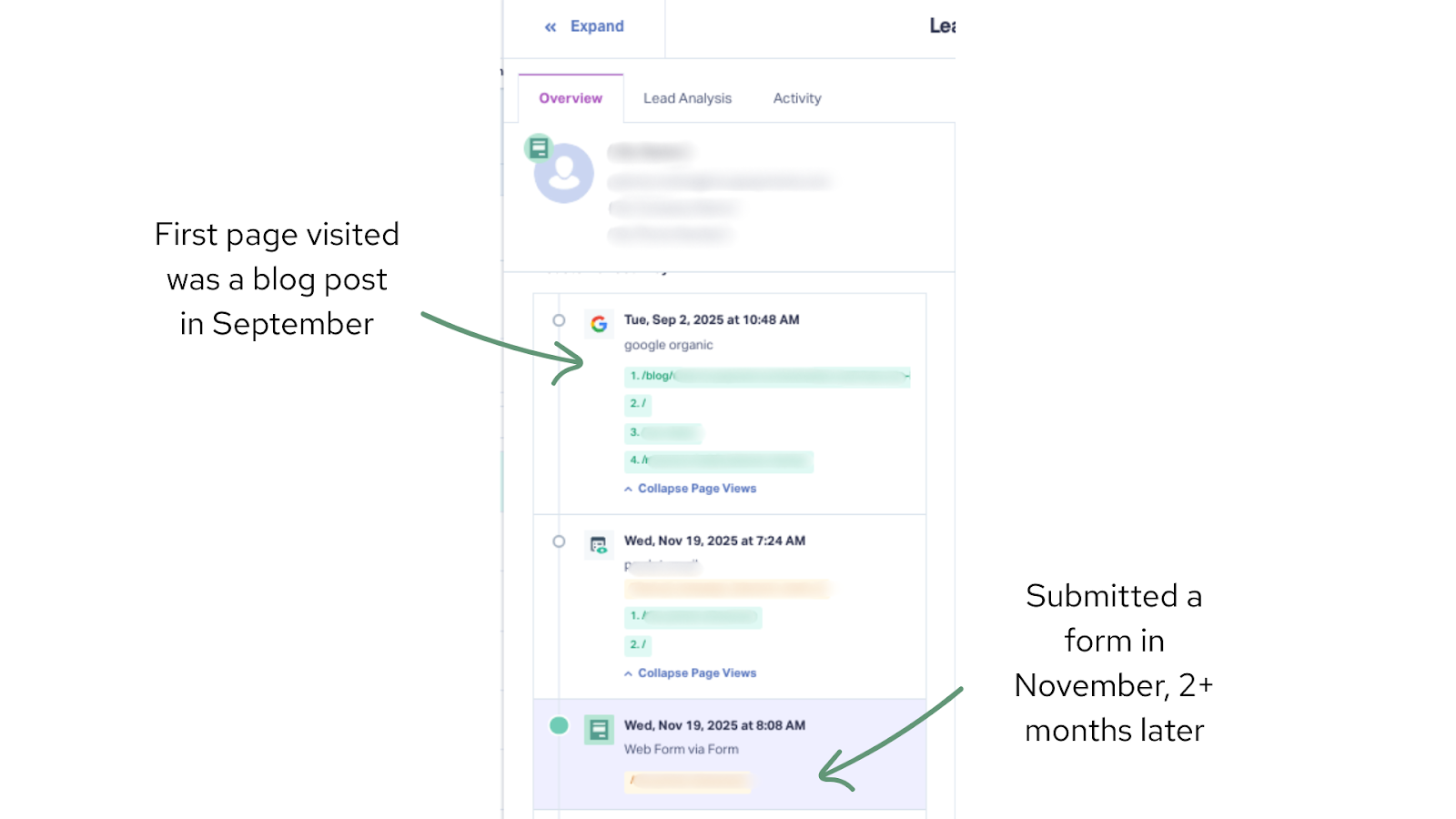 In the screenshot below, you can see that the prospect first read a piece of content in September, but didn’t convert until over 2 months later (and read a few other product pages in between). This is a common pattern with content since people often read multiple pieces of content across months before converting.