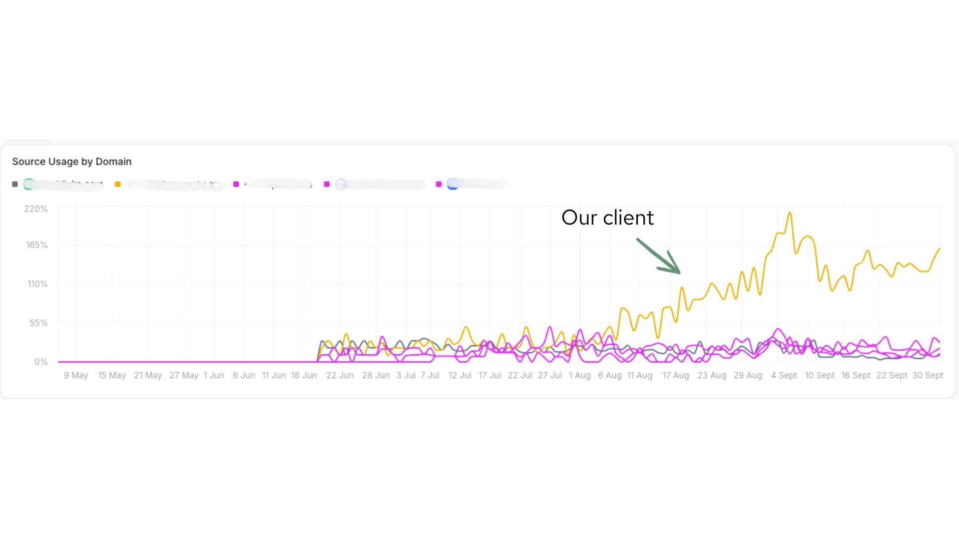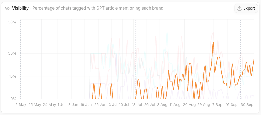 After less than one month of work, we saw their visibility start to grow substantially. Filtering for only prompts added on the 29th July, you can see their visibility grew to an astounding 56.6% by the end of September, outcompeting other companies with much bigger budgets.